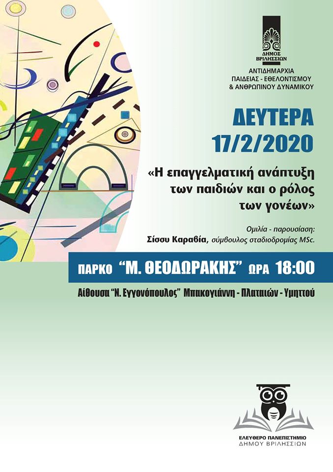 Η Αντιδημαρχία Παιδείας-Εθελοντισμού & Ανθρώπινου Δυναμικού του Δήμου Βριλησσίων, σας προσκαλεί τη Δευτέρα 9 Μαρτίου 2020 και ώρα 18.00, σε διάλεξη του Ελεύθερου Πανεπιστημίου, η οποία θα πραγματοποιηθεί στην αίθουσα…