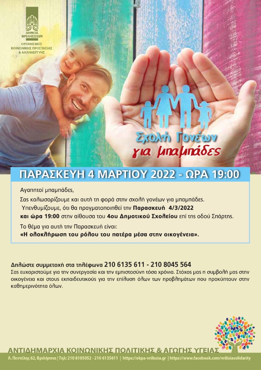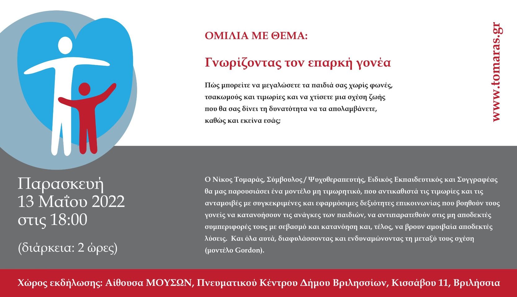 ΣΧΟΛΗ ΓΟΝΕΩΝ ΔΙΑ ΖΩΣΗΣ Παρασκευή 13 Μαίου 2022 Τίτλος ομιλίας: Γνωρίζοντας τον επαρκή γονέα με τον Νίκο Τομαρά, Σύμβουλο / Ψυχοθεραπευτή, Ειδικό Εκπαιδευτικό και Συγγραφέα