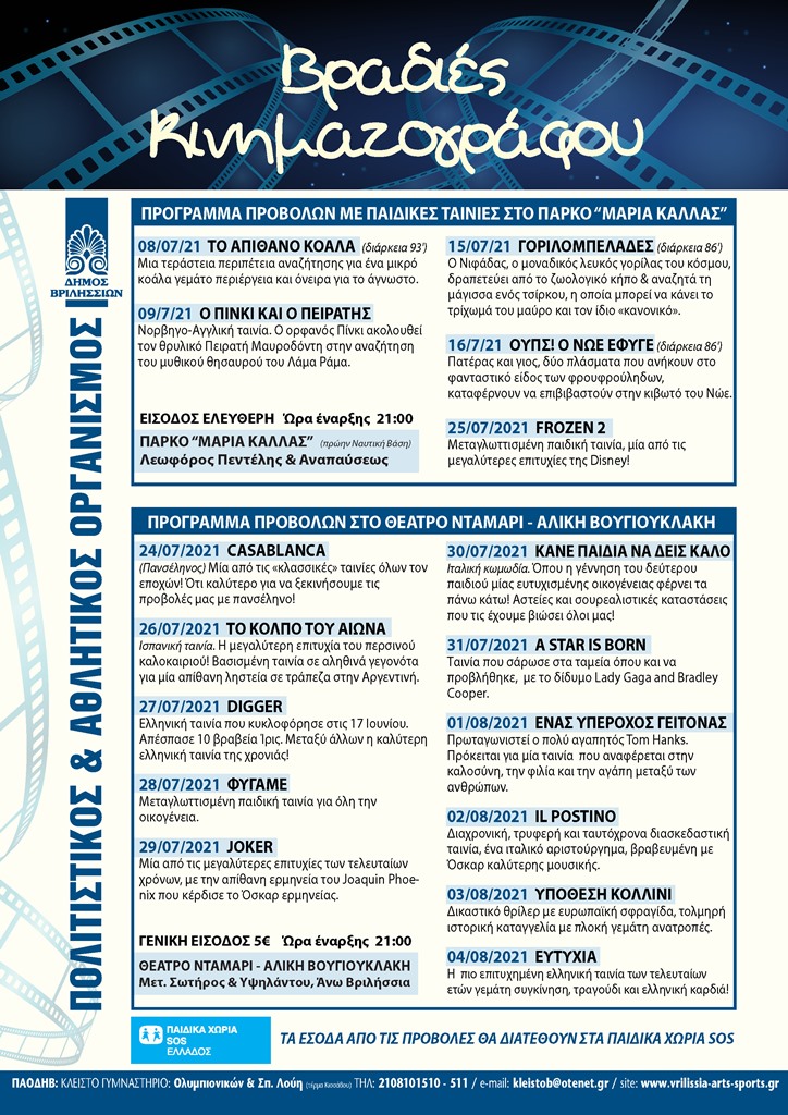 ΒΡΑΔΙΕΣ ΚΙΝΗΜΑΤΟΓΡΑΦΟΥ ΣΤΟ ΠΑΡΚΟ ΜΑΡΙΑ ΚΑΛΛΑΣ & στο ΘΕΑΤΡΟ ΝΤΑΜΑΡΙ-ΑΛΙΚΗ ΒΟΥΓΙΟΥΚΛΑΚΗ Για πρώτη φορά ο Δήμος Βριλησσίων θα οργανώσει θερινές προβολές ταινιών στο πάρκο ΜΑΡΙΑ ΚΑΛΛΑΣ (πρώην Ναυτική Βάση -…