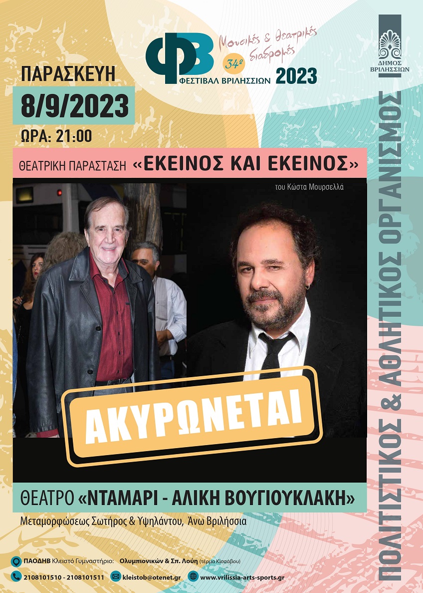 Η θεατρική παράσταση «ΕΚΕΙΝΟΣ ΚΑΙ ΕΚΕΙΝΟΣ», που ήταν προγραμματισμένη για την Παρασκευή 8 Σεπτεμβρίου 2023,