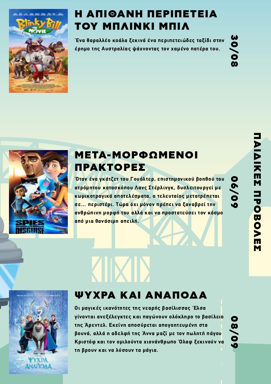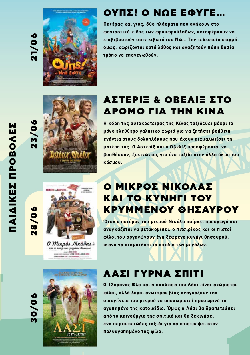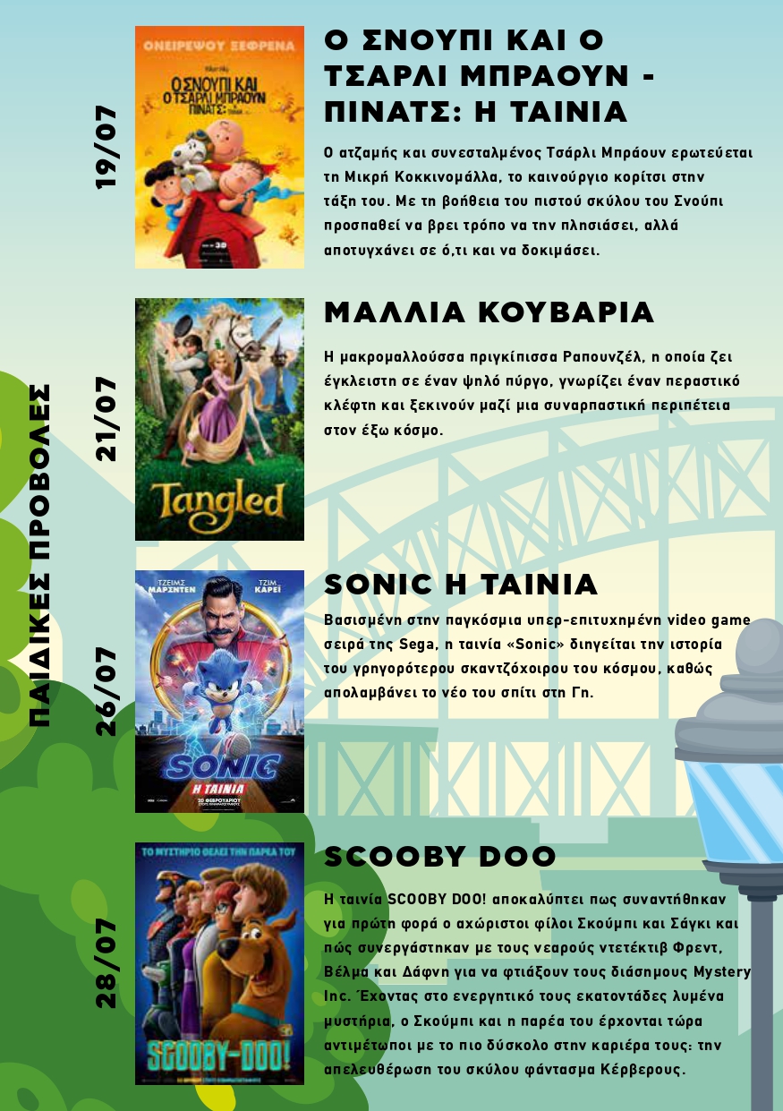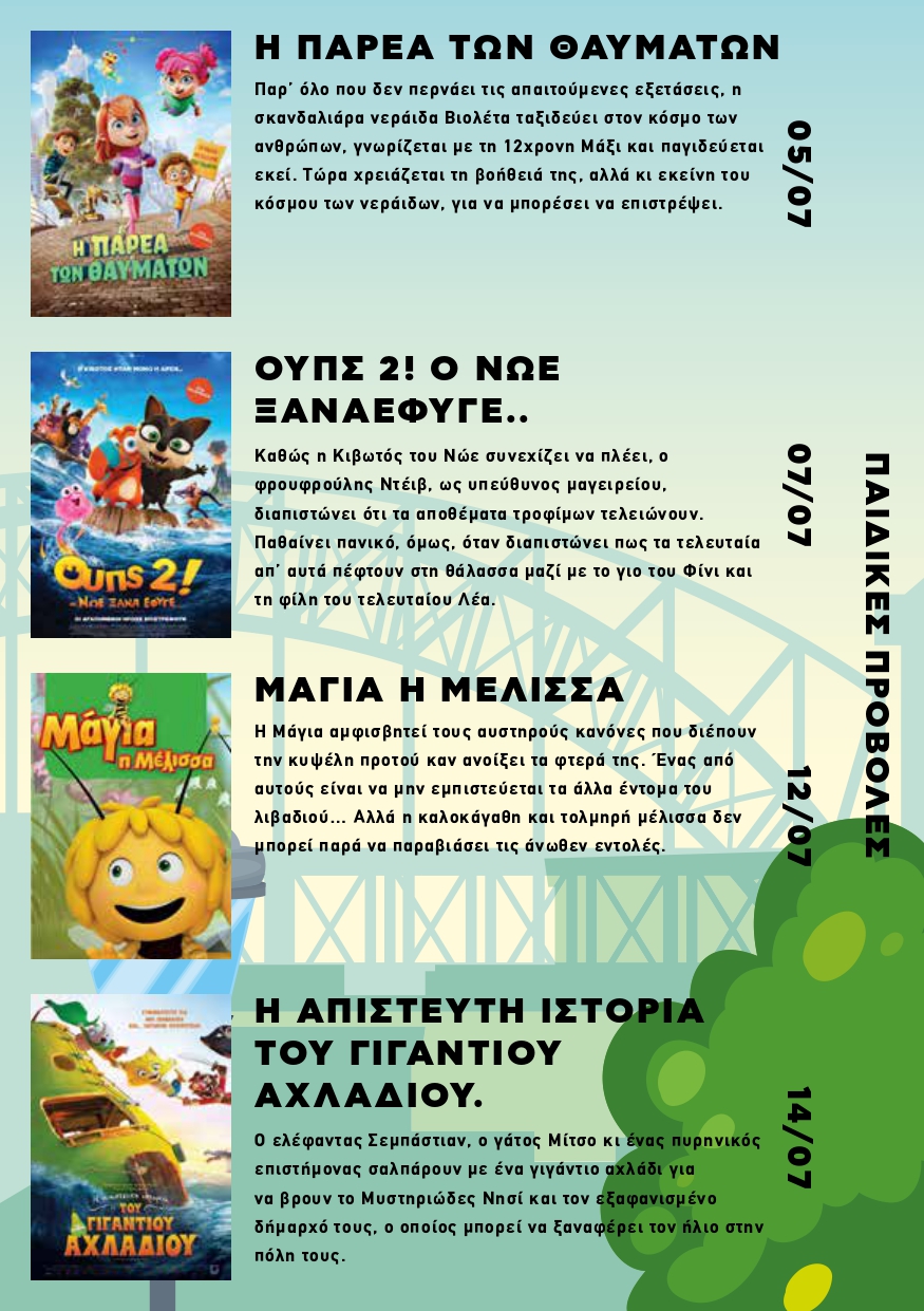 Ξεκινά τη Δευτέρα 19 Ιουλίου 2023 ο 1ος κύκλος των κινηματογραφικών προβολών στο Πάρκο ΜΑΡΙΑ ΚΑΛΛΑΣ (πρώην Ναυτική Βάση), Λεωφ. Πεντέλης & Αναπαύσεως στα Βριλήσσια. Οι παιδικές προβολές θα γίνονται κάθε Τετάρτη & Παρασκευή και για τους ενήλικες κάθε Δευτέρα. Η είσοδος για όλες τις προβολές είναι ελεύθερη για το κοινό. Ώρα έναρξης προβολών : 21:00
