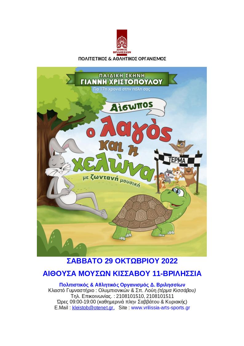 Μια βραδιά αφιερωμένη στη μνήμη του εμβληματικού Δασκάλου της παραδοσιακής μας μουσικής Χρόνη Αηδονίδη διοργανώνει ο Δήμος Βριλησσίων στο θέατρο «Αλίκη Βουγιουκλάκη» (Μεταμορφώσεως του Σωτήρος και Υψηλάντου, Άνω Βριλήσσια). Την…