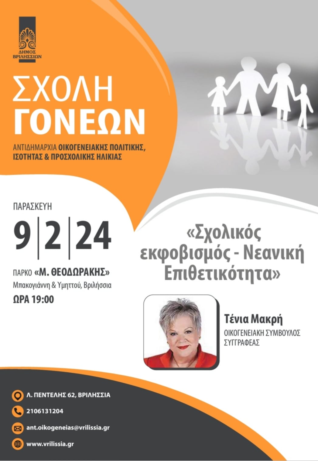 Ξεκινά η Σχολή Γονέων: «Νεανική Επιθετικότητα-Σχολικός Εκφοβισμός» με ομιλήτρια την Τένια Μακρή στις 9/2 στο ΤΥΠΕΤ