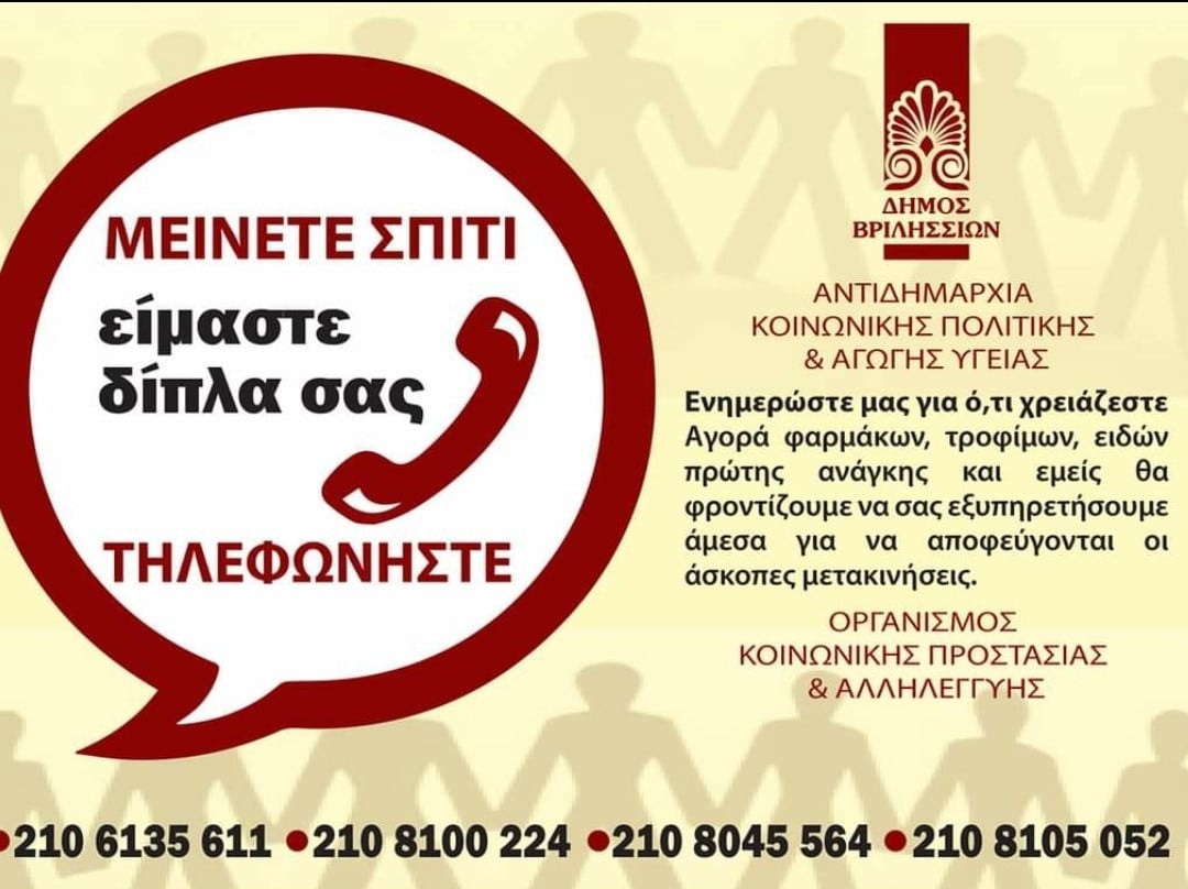 H Αντιδημαρχία Κοινωνικής Πολιτικής και Αγωγής Υγείας του Δήμου Βριλησσίων ενημερώνει οτι μετά την ανακοίνωση των νέων έκτακτων περιοριστικών μέτρων, επαναφέρει σε λειτουργία το πρόγραμμα «Μείνετε σπίτι, είμαστε δίπλα σας» με …
