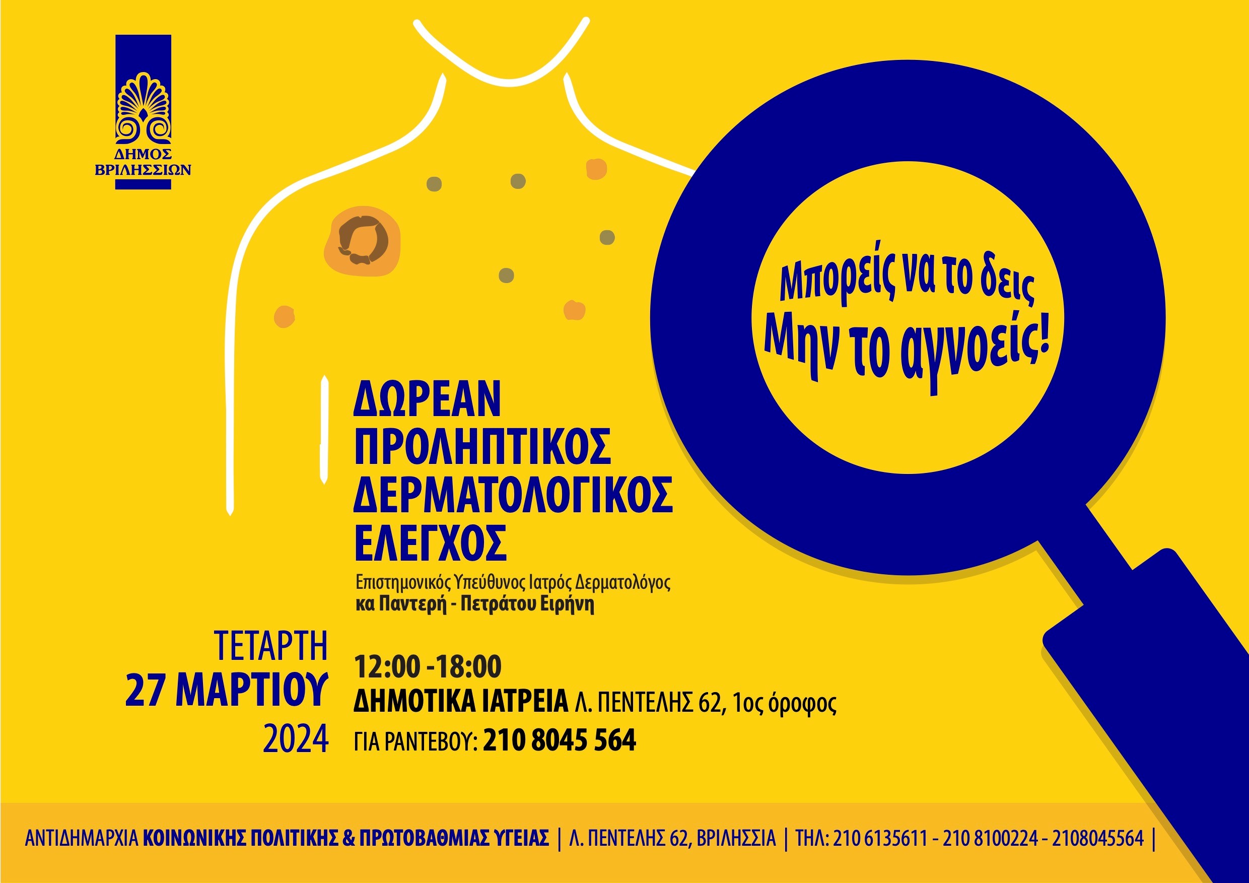 Ο Δήμος Βριλησσίων μέσω της Αντιδημαρχίας Κοινωνικής Πολιτικής και Πρωτοβάθμιας Φροντίδας Υγείας διενεργεί δωρεάν προληπτικό δερματολογικό έλεγχο για όλους τους συμπολίτες μας στα Δημοτικά Ιατρεία (Λ. Πεντέλης 62, 1ος όροφος) την Τετάρτη 27 Μαρτίου 2024 από τις 12 το μεσημέρι έως τις 6 το απόγευμα.