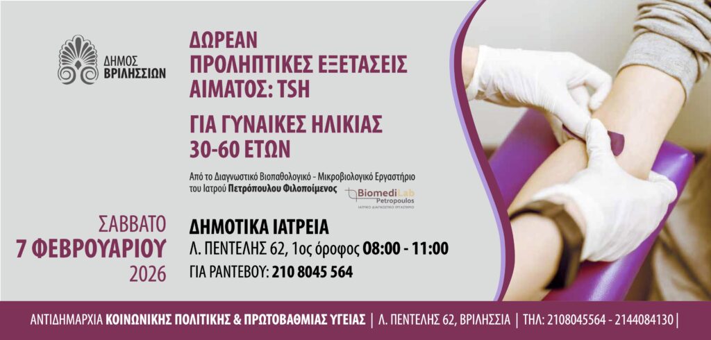 Στο πλαίσιο της ενίσχυσης της πρόληψης, ο Δήμος Βριλησσίων, μέσω της Αντιδημαρχίας Κοινωνικής Πολιτικής και Πρωτοβάθμιας Υγείας, διοργανώνει δράση δωρεάν αιματολογικών εξετάσεων για τη μέτρηση της θυρεοειδοτρόπου ορμόνης (TSH). Η δράση, η οποία απευθύνεται σε γυναίκες ηλικίας 30 έως 60 ετών, θα πραγματοποιηθεί το Σάββατο 7 Φεβρουαρίου 2026, από τις 08:00 έως τις 11:00 το πρωί, στα Δημοτικά Ιατρεία (Λ. Πεντέλης 62, 1ος όροφος). Οι ενδιαφερόμενες παρακαλούνται να προγραμματίσουν έγκαιρα το ραντεβού τους καλώντας στο τηλέφωνο 210 8045564.