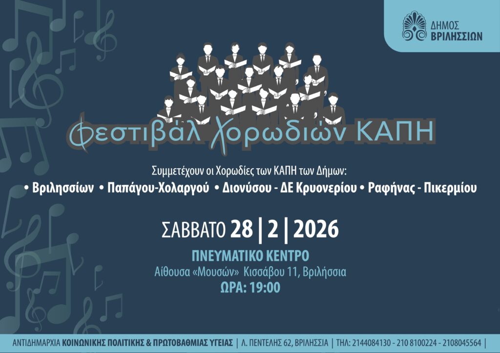 Ο Δήμος Βριλησσίων, μέσω της Αντιδημαρχίας Κοινωνικής Πολιτικής και Πρωτοβάθμιας Υγείας, με στόχο την ενίσχυση της ενεργούς συμμετοχής και της δημιουργικής έκφρασης των μελών των Κέντρων Ανοιχτής Προστασίας Ηλικιωμένων (ΚΑΠΗ), διοργανώνει Φεστιβάλ Χορωδιών ΚΑΠΗ.