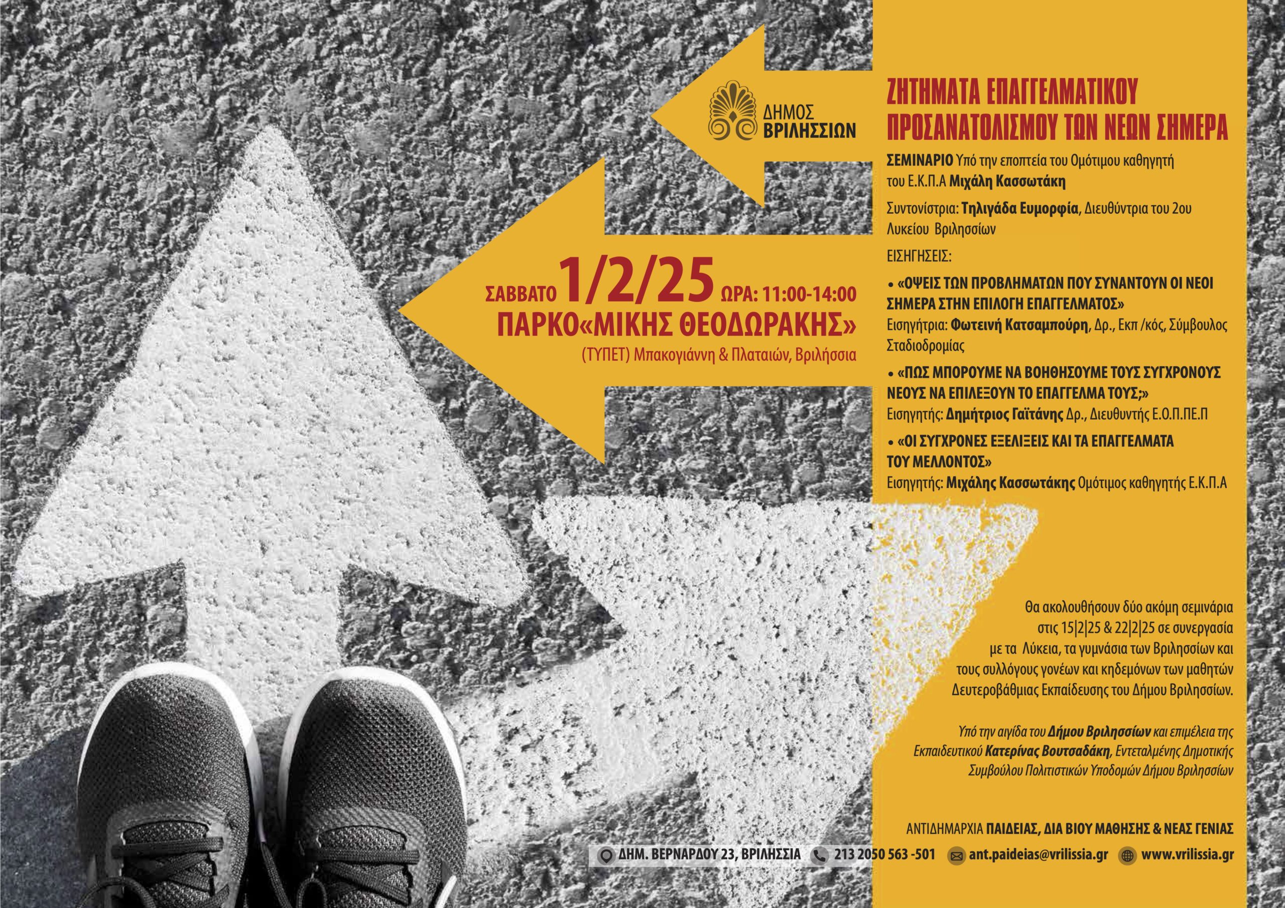 Εστιάζοντας σε θέματα που αφορούν τη νέα γενιά της πόλης μας, σε συνεργασία με τον Ομότιμο καθηγητή του Πανεπιστημίου Αθηνών κ. Μιχάλη Κασσωτάκη ο Δήμος Βριλησσίων διοργανώνει κύκλο σεμιναρίων Επαγγελματικού…