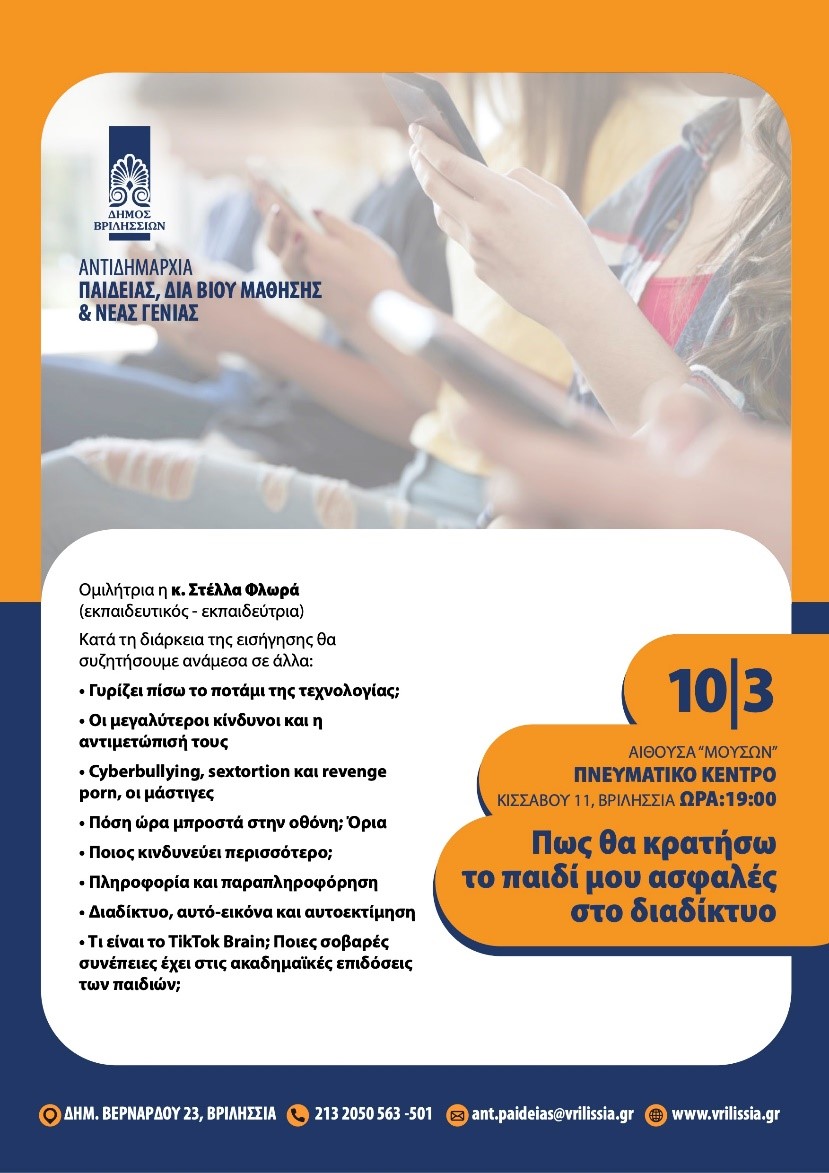 Η Αντιδημαρχία Παιδείας Δια Βίου Μάθησης και Νέας Γενιάς του Δήμου Βριλησσίων διοργανώνει εκδήλωση με θέμα: «Πώς θα κρατήσω το παιδί μου ασφαλές στο διαδίκτυο»την Κυριακή 10 Μαρτίου 2024 στο…