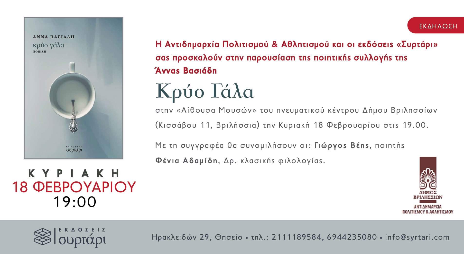 Άννας Βασιάδη, «Κρύο Γάλα» στην «Αίθουσα Μουσών» του Πνευματικού Kέντρου Δήμου Βριλησσίων (Κισσάβου 11, Βριλήσσια) την Κυριακή 18 Φεβρουαρίου στις 19.00.  Με τη συγγραφέα θα συνομιλήσουν οι: Γιώργος Βέης, ποιητής, Φένια Αδαμίδη, Δρ. κλασσικής φιλολογίας.