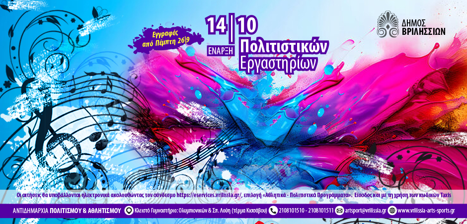 Από την Πέμπτη 26/09/2024 ξεκινούν οι εγγραφές στα Πολιτιστικά Εργαστήρια του Δήμου Βριλησσίων 2024-2025. Οι αιτήσεις θα υποβάλλονται ηλεκτρονικά με την είσοδο σας στην ψηφιακή πλατφόρμα, ακολουθώντας τον σύνδεσμο https://eservices.vrilissia.gr/, επιλέγετε «Αθλητικά –…