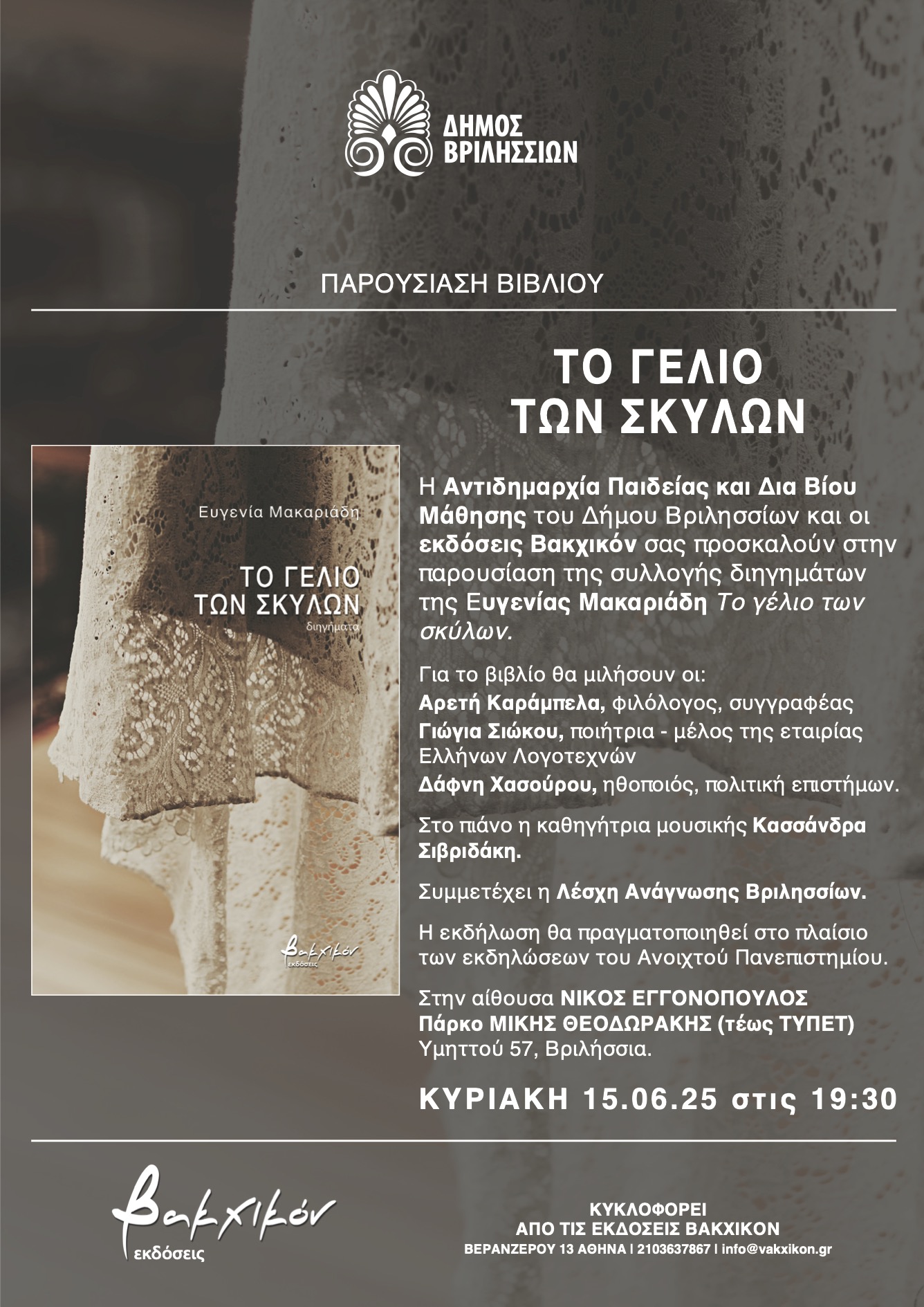 Η Αντιδημαρχία Παιδείας και Δια Βίου Μάθησης του Δήμου Βριλησσίων και οι εκδόσεις Βακχικόν σας προσκαλούν στην παρουσίαση της συλλογής διηγημάτων της Ευγενίας Μακαριάδη «Το Γέλιο των Σκύλων» Η συγγραφέας…